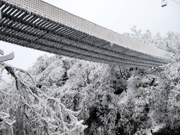 由于淡季,不用排隊很快坐上了索道,前前后后的轎廂內(nèi)都沒人,俺倆坐著好不優(yōu)哉。索道漸次翻越而后陡然爬升,進入乳白色的氤氳之中,最后全被濃厚的霧氣包裹,像在云霧中漂移。俺又爽又驚,心想神仙還真不是好當?shù)???粗懊娴牟僮髡f明:沒事,這個挺先進的,碰到惡劣天氣會自動停止運行。話音剛落,它就停了,然后左右左右的晃啊晃啊。俺顫顫地問:怕嗎?他說:嗯……還,還成。俺喃喃地道:靠,俺可不想死呢……終于正襟危坐地熬過了那幾分鐘的晃悠,繼續(xù)上行后,霧氣淡了許多,這才看到索道支架和輪軌竟然都凍上厚厚的冰掛。心肝一顫:不是吧,這是到哪了???!