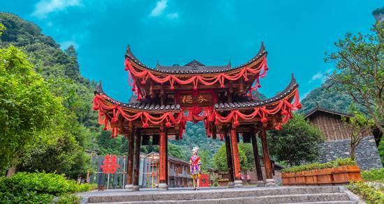 在風(fēng)景秀麗的湘西武陵源風(fēng)景區(qū)內(nèi),鑲嵌著一顆璀璨的明珠——德夯苗族村?!暗潞弧睘槊缯Z,意為美麗的峽谷,距湘西自治州首府吉首市約24千米。這是一塊神奇的土地,這里溪流縱橫,峽谷深壑,瀑布飛瀉,落差達(dá)216米的流紗瀑布,如白練凌空,似銀紗懸壁。這里群峰競秀,盤古峰海拔700多米,峰頂呈葫蘆狀,分大小兩峰,絕壁千仞,天險(xiǎn)難度,站立峰頂,方圓景色盡收眼底。這里有著名的公路奇觀,這便是湘川公路上最險(xiǎn)關(guān)卡——矮寨天險(xiǎn),從山麓到山頂全長只有6千米,卻轉(zhuǎn)了13道彎,公路如白帶盤旋于青山之上,車行路上,伸手可抓到窗外白絮般的云霧。德夯距湘西自治州州府吉首市,屬省級(jí)風(fēng)景名勝區(qū)。這里山勢(shì)跌宕,絕壁高聳,峰林重疊,形成了許多斷崖、石壁、瀑布、原始森林。區(qū)內(nèi)溪河交錯(cuò),四季如春,氣候宜人,有豐富的動(dòng)、植物資源,自然風(fēng)光秀麗迷人。自矮寨鎮(zhèn)沿溪上行4公里至德夯苗寨,沿岸筒車、水輾、古渡、小舟,伴以苗家吊腳樓,一派田園詩情。九龍溪穿寨而過,四周山色清幽,懸崖如削。過石拱橋可登盤古峰,峰高400余米,山巔有大、小兩峰,頂寬約5公頃多,為盤根錯(cuò)節(jié)的原始森林,四周絕壁,站立峰頂,方圓景色盡收眼底。