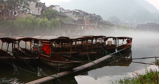 沱江河是古城鳳凰的母親河,她依著城墻緩緩流淌,世世代代哺育著古城兒女。坐上烏蓬船,聽著艄公的號(hào)子,看著兩岸已有百年歷史的土家吊腳樓,別有一番韻味。順?biāo)?,穿過虹橋一幅江南水鄉(xiāng)的畫卷便展現(xiàn)于眼前:萬壽宮、萬名塔、奪翠樓……一種遠(yuǎn)離塵世的感覺悠然而生。沱江的南岸是古城墻,用紫紅沙石砌成,典雅不失雄偉。城墻有東、北兩座城樓,久經(jīng)滄桑,依然壯觀?! °铀宄海菈叺暮拥篮軠\,水流悠游緩和,可以看到柔波里招搖的水草,可以撐一支長(zhǎng)篙漫溯。沿沱江邊而建的吊腳樓群在東門虹橋和北門跳巖附近,細(xì)腳伶仃的立在沱江里,象一幅永不回來的風(fēng)景。