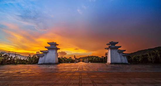 炎帝陵闕門位于公祭區(qū)入口處,2011年5月,該工程榮獲株洲市“十大標(biāo)志性重點工程”,采用最先進(jìn)的石材干掛工藝建造而成。主塔高17.09米,被譽為“中華第一闕”。沿祭祀大道兩側(cè)立5對五谷柱,高8.79 米,直徑1.2 米,分別雕飾稻、梁、菽、麥、黍圖案。