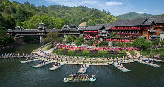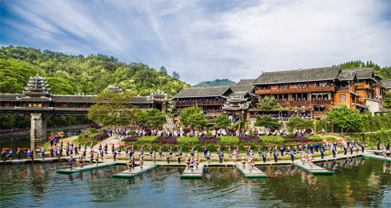 觀看皇都侗族文化村藝術(shù)團(tuán)的精彩表演,則是另外一番享受,《敬酒歌》 、《扯扯摸》 、 《踩簸箕》 、 《禾桿歌》、 《鬧茶》 《搶蛋》、《板凳情歌》 、《筒地咯羅鬧歌堂》等一組民族色彩十分濃厚的文化節(jié)目匯集了侗族傳統(tǒng)文化的精華,輕歌曼舞,回腸蕩氣,于行云流水間透出一種陽剛之美。