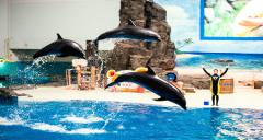 極地館:主要為極地動物區(qū),分為白鯨池、海獅池、海豚池、海豹池、企鵝池、水獺池等水生生物展示休息表演池,以及北極狼舍、北極狐舍等陸生生物展示休息籠舍。館內建有一個高大寬敞明亮,音響等設備設施先進配備LED大型顯示屏的表演劇場,可供1800多游客同時近距離觀賞海豚、海獅等精彩表演。